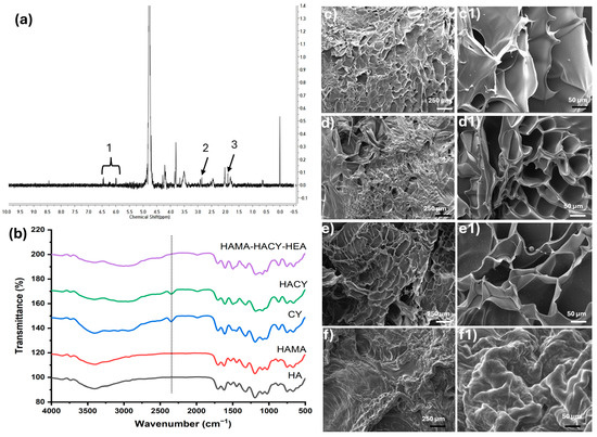(a) NMR of 700 µL HEA hydrogel. (b) FTIR of raw materials, intermediate components and final hydrogel, and SEM analysis of four-different hydrogels. (c,c1) 300 µL HEA, (d,d1) 500 µL HEA, (e,e1) 700 µL HEA, and (f,f1) 1000 µL HEA.