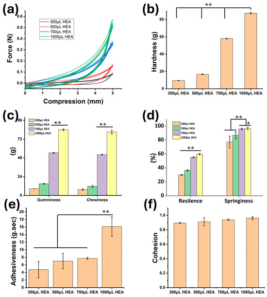 Mechanical texture properties of hydrogels: (a) cyclic compression (5 cycles), (b) hardness, (c) gumminess and chewiness, (d) resilience and springiness, (e) adhesiveness, (f) cohesion. (** p ≤ 0.01, * p ≤ 0.05).
