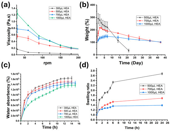 Figure 3 shows different physical properties of hydrogels synthesized in this study. The viscosity of hydrogels measured at different rpm indicates the shear thinning nature of the hydrogels (Figure 3a). While 300 µL HEA cannot withstand the high shear rate above 90 rpm and its viscosity falls to near zero, the other compositions have reasonable viscosity even at 240 rpm. This viscous property would help these compositions to extrude for 3D printing or bioprinting. The degradation in PBS at 37 °C (normal body temperature) shows stability in weight retention for 700 µL HEA and 1000 µL HEA samples up to 42 days, while the 300 µL HEA sample degrades or disintegrates within a day (shown in the Supplementary File) and 500 µL HEA shows sharp weight loss within 20 days. The initial weight gain is due to the highly water-absorbing nature of the hydrogel, which reduces with the increase in crosslinking density. The water absorbency of the lyophilized hydrogels shows very high-water absorption capacity for all the compositions. With an increase in HEA amount in the hydrogel, the water absorbency reduces to almost half compared to 300 µL HEA samples. Within 10 h, all the hydrogels’ water absorbency stabilizes. The equilibrium water absorption ratio or mass swelling ratio was used to calculate the crosslinking density of the hydrogels. The average values (in mol/cm3) for 300 µL HEA, 500 µL HEA, 700 µL HEA, and 1000 µL HEA samples are 1.50 × 10−8, 1.74 × 10−8, 1.83 × 10−8, and 2.03 × 10−8, respectively. All the compositions have shown less water absorbency (or the swelling ratio on a weight basis) than the reported values for hydrogel-based 3D bioprinting [25] and thus qualify for the application. More crosslinking means less swelling; however, that will compromise the extrusion ability. The diameter swelling mostly affects the post-printing structural fidelity. The extruded lines of 700 µL HEA and 1000 µL HEA samples were tested for their diameter swelling ratio after printing. The 500 µL HEA sample was found to keep swelling even after 24 h and swelled to more than 2.5 times its original diameter. Though 1000 μL HEA has the lowest swelling ratio (~1.3) due to higher crosslinking, it is hard to extrude and cannot be extruded smoothly using fine needles. Considering all these, the 700 μL HEA was selected for the drug loading and 3D bioprinting. The 700 μL HEA has a ~1.5 swelling ratio after 6 h, which is reasonably stable until the end of the study (24 h).