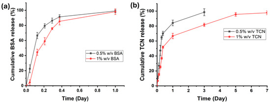 In vitro drug/biomolecule release study: (a) BSA, (b) TCN.