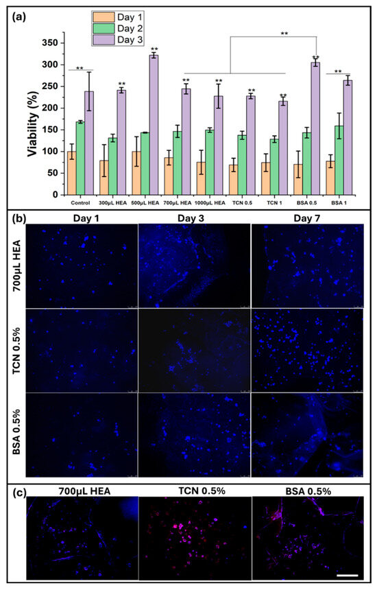 A cytotoxicity study of all hydrogel combinations and drug-loaded hydrogels was carried out using the MTT assay (Figure 7a). In the MTT assay, yellow tetrazolium salt is converted to crystals of purple formazan by dehydrogenase from the metabolically dynamic cells. The purple formazan amount corresponds to the quantity of viable cells. Consequently, this is utilized to survey the in vitro cytocompatibility and expansion in cell multiplication of proliferation of various hydrogels. For cytotoxicity evaluation through MTT assay, over 70% cell viability is viewed as nontoxic [32]. Cell viability estimated utilizing the MTT assay shows that every one of the gels is nontoxic and supportive to the cells. TCN and BSA were loaded with a 700 µL HEA sample, as it is the best among all combinations for extrusion 3D printing. However, among all HEA amounts used for crosslinking, 500 µL shows the best result in terms of viability. The cell proliferation is significantly higher for 500 µL HEA hydrogels. Among all drug-loaded samples, the 0.5% BSA-loaded 700 µL HEA hydrogel also exhibits significantly high cell growth on day 3. Use of 0.5% BSA improves the viability of 700 µL HEA samples significantly to the level of 500 µL HEA. This indicates that though the cell growth rate is affected by the use of a higher amount of HEA, the use of BSA can improve the cell viability significantly. Hence, the 3D printability and cell growth rate can both be taken care of.