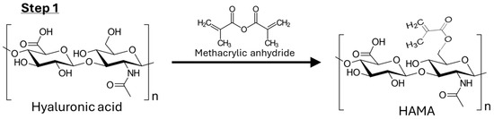 Hyaluronic acid (1.0 g) was dissolved in distilled water (100 mL) in a 250 mL double-necked round-bottom flask by stirring overnight at room temperature. After dissolving, 7.5 mL of methacrylic anhydride was added dropwise and stirred for 24 h. pH was adjusted to 8.0–9.5 using a 3 mM sodium hydroxide solution. Unreacted methacrylate was removed by adding 30 mL of 70% ethanol to form a precipitate. After forming precipitation, excess ethanol was removed, and precipitations were collected. The product (Scheme 1) was dialyzed (Mw cut-off 6–8 kDa) with 5 L distilled water for 48 h with repeated water replacements at every 12 h, frozen at −80 °C for 24 h, and lyophilized for 5 days.