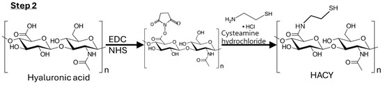 Hyaluronic acid (1.0 g) was dissolved in distilled water (100 mL) in a 250 mL two-necked round-bottom flask. Then, 1.2 g EDC and 1.6 g N-hydroxy succinimide were added to the HA solution. This mixture was allowed to react while stirring constantly for 5 h. After that, 1.8 g of cysteamine hydrochloride was added to the mixture and allowed to react overnight with continuous stirring. The product (Scheme 2) was dialyzed (Mw cut-off 6–8 kDa) with 5 L distilled water for 48 h with repeated water replacements at every 12 h, frozen at −80 °C for 24 h, and lyophilized for 5 days.