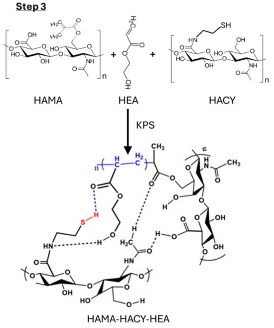 Synthesis reaction for HAMA-HACY-HEA hydrogel.