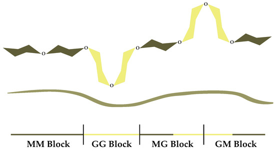 Alginate, a polysaccharide found in brown algae, is a linear copolymer consisting of residues of α-L-guluronic (G) and β-D-mannuronic (M) acids that are connected by 1,4 glycosidic bonds, where the G and M sequences differ in terms of number and position (Figure 1) [1].