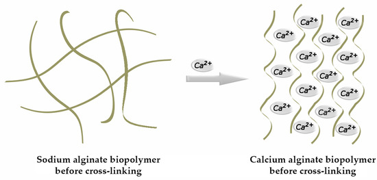 The above-mentioned gel-forming ability is considered its supreme functional property. Of the cations used to synthesize alginate ionic gel, the Ca2+ ion is the most commonly used [6]. Gelation occurs through its binding with G sections of the alginate molecule, during which a specific “egg-box” configuration is formed (Figure 2) [7].
