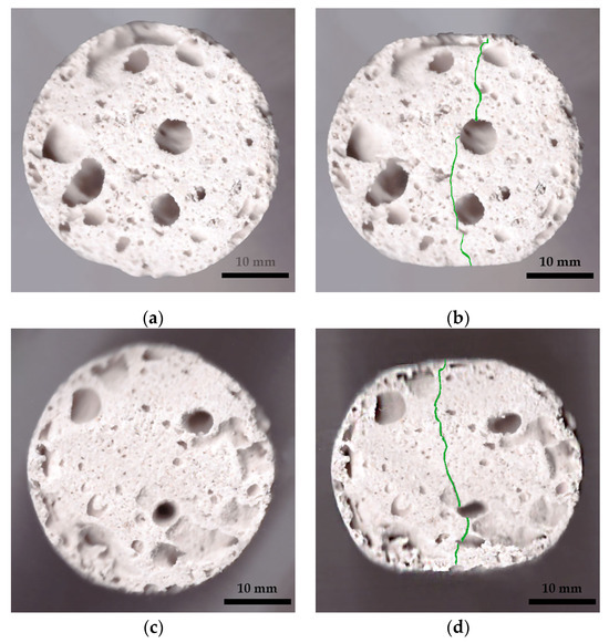Examples of specimen shapes before and after the Brazilian test. Specimen 0 (A+P): (a) before testing and (b) after testing, with the crack line marked; Specimen 8 (A+P+15Gl): (c) before testing and (d) after testing, with the crack line marked.