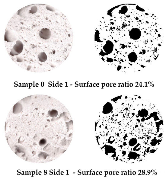 Examples of labeled surface pores on Specimen 0 (A+P) and Specimen 8 (A+P+15Gl) and calculated surface pore ratios.