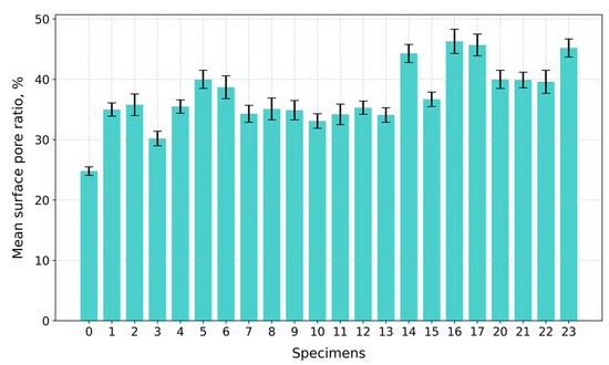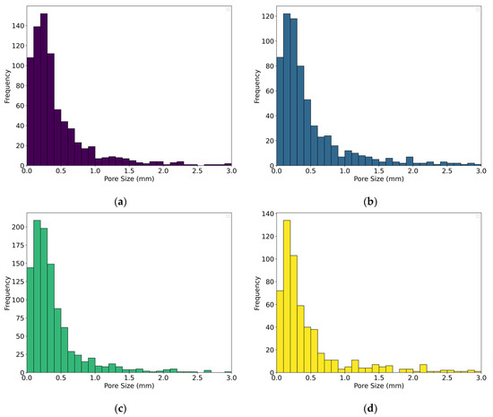 As can be seen from Figure 9a–d, which show the pore size distribution for Specimens 0, 5, 8, and 12, the size of the pores is predominantly below 0.5 mm, with pore sizes most frequently ranging from 0.1 to 0.3 mm. The second group of specimens possess pore sizes with diameters between 0.5 and 1.0 mm, whilst a minority of pores have sizes above 1.0 mm. The pore size distribution trend is very similar for Specimens 0, 5, and 8 and slightly different for Specimen 12 for pore sizes up to 0.4 mm.