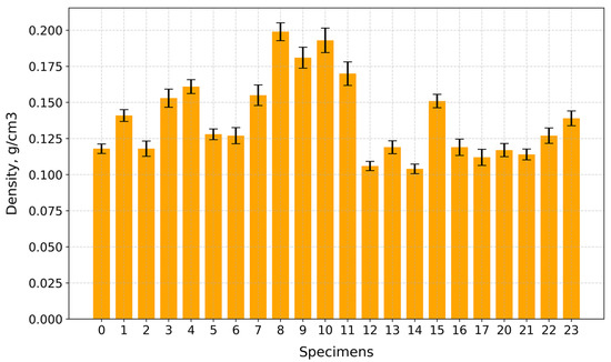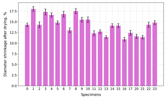 Under compression, the surface at the top and bottom contact points of the disk-shaped specimens (Figure 3a,c) underwent flattening, forming load and crack lines (Figure 3b,d) stretching from the top to the bottom of the flattened load contact surfaces. For the sake of uniformity, all specimen images were processed and centrally cropped to the same diameter and then segmented to determine the areas of pores on the specimen surfaces and their ratios (Figure 4). This behavior was observed for all specimens, regardless of their composition. The mean surface pore ratios (the mean value of the pore ratio on both sides of specimen) fall within the range of 24.8–46.3% (Figure 5), while the density values circle around 0.104–0.199 g/cm3 (Figure 6), and the diameter shrinkage, after drying, is in the range of 11.4–18.0% (Figure 7). These values are presented in Table 1.