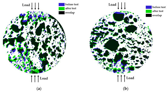 Figure 8 displays the change in the specimens’ pore shapes after testing. As can be observed, there are no visible shape alterations for the largest pores, except when these large pores are close to the loading areas and are within the plastic deformation zone. Small pores, however, undergo shape changes in the near-load regions and even in the central areas for some specimens.