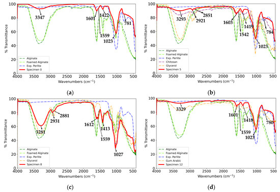 The obtained FTIR spectra of selected specimens (Figure 10a–d) indicate the presence of characteristic alginate bands, which is in accordance with the literature data. In addition to these spectra, the spectra of constituents are also given, including the spectrum of alginate without reinforcement and additives that were foamed using the same procedure as that for the specimens. The bands in the range of 3400–3200 cm−1 can be assigned to the stretching vibrations of -OH groups, and those in the range of 2921–2931 cm−1 can be assigned to the stretching vibrations of aliphatic -CH groups. The bands at 1600–1612 cm−1 and 1413–1419 cm−1 can be attributed to the asymmetric and symmetric stretching vibrations of carboxylate groups, respectively [64,65,66,67]. The strong large band at 1015 cm−1 and the band at 784 cm−1 can be assigned to asymmetric and symmetric Si-O-Si (or Si-O-Al) stretching vibrations, respectively, in the expanded perlite [68].