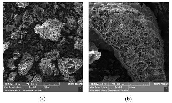 SEM micrographs of the expanded perlite particles used in this study at different magnifications are presented in Figure 11. A specific expanded perlite structure consisting of pores separated by thin walls is observed (Figure 11a). Some of the pores do not have outer shells, or they are partially broken, as can be seen on the left side of the particle presented in Figure 11b, while other pores are enclosed within the shell walls, which can be observed on the right upper side of the same particle. The central upper part of the presented particle is covered by smaller shell shreds.