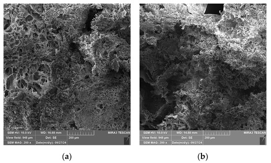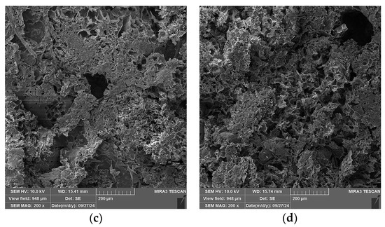 In Figure 12, SEM micrographs of four selected specimens are shown: Specimen 0, containing only A and P and no plasticizers; Specimen 5, containing A, P, Ch, and glycerol plasticizer (1 wt.%); Specimen 8, containing A, P, and glycerol (15 wt.%); and Specimen 9, containing A, P, and gum arabic plasticizer (1 wt.%). A change in the microstructure of the specimens is observed when comparing the micrographs in Figure 12a–d. For Specimen 0 (Figure 12a), segments with expanded perlite particle pores can be clearly observed, whilst for the other three specimens (Figure 12b–d), it can be observed that the pores are mostly covered by alginate layers, with the particles of Specimen 5 (Figure 12b) being covered the most.