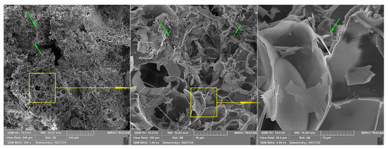 Figure 13 displays three magnitudes of magnification for one segment of an expanded perlite particle. For all three magnifications, organic segments can be observed (green arrows).
