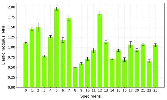 Figure 14 displays the elastic modulus values of the tested specimens. The highest modulus values are reported: Specimen 5 (A+P+Ch+5Gl)—1.96 MPa; Specimen 12 (A+P+1GA)—1.83 MPa; and Specimen 7 (A+P+Ch+IC+5Gl)—1.73 MPa. All of these specimens contain a plasticizer. Some specimens without plasticizers also have higher modulus values: Specimen 2 (A+P+IC)—1.50 MPa—and Specimen 1 (A+P+Ch)—1.46 MPa. Specimens 8 (A+P+15Gl) (0.50 MPa) and 9 (A+P+Ch+15Gl) (0.59 MPa) have the lowest modulus values.
