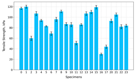 Regarding tensile strength (Figure 15), the highest values are for Specimen 1 (A+P+Ch)—120 kPa—Specimen 15 (A+P+5GA)—119 kPa—and Specimen 0 (A+P)—117 kPa—whilst the lowest values are for Specimen 16 (A+P+Ch+IC+1GA)—30 kPa—and Specimen 17 (A+P+Ch+5GA)—44 kPa.