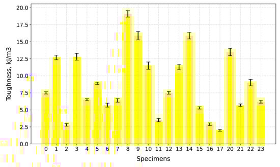 The highest toughness value is observed for Specimen 8 (A+P+15Gl) at 19.1 kJ/m3, while the lowest is for Specimen 17 (A+P+Ch+5GA) at 2.0 kJ/m3, as can be seen in Figure 16.
