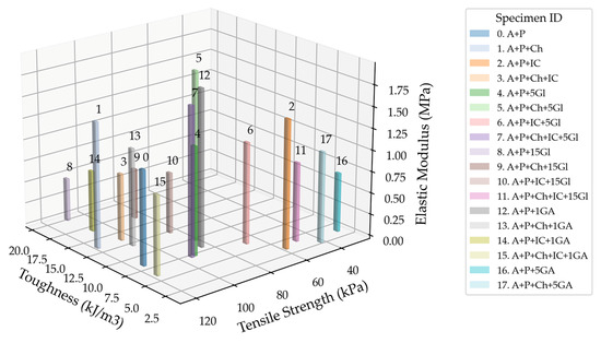 Figure 17 displays the ratio of three different properties: elastic modulus, tensile strength, and toughness. The specimen with the optimal combination of these properties (the highest possible values in a given set of values for a specimen) is Specimen 1 (A+P+Ch). On the other hand, Specimen 16 (A+P+Ch+IC+1GA) has the combination with the lowest values.