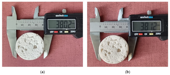 Figure 18a and Figure 18b show the appearance and dimensions of a specimen before and after testing, respectively. All specimens maintained their dimensional and structural stability. In Table 2, the percentage absorption values for each specimen are given.