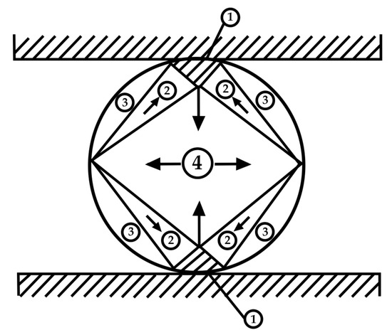 Under such stress, four zones are distinguished: 1—zone of triaxial stress; 2—zone of uniaxial stress; 3—neutral zone; and 4—tension zone.