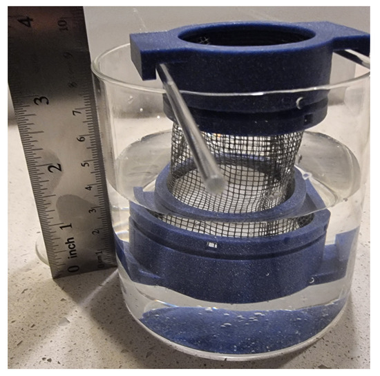 The water absorption test was conducted according to the ASTM standard D570 [79]. Since the material we are investigating is porous, they were immersed for 2 h. First, the specimens were dried to a constant mass (in an oven at 30 °C), after which their mass and diameter were measured. Then, the specimens were submerged in distilled water for 2 h (Figure 20). After this, the surface moisture was removed with a cloth, and their mass and diameter were measured again. Water absorption was calculated using the following formula [79]: