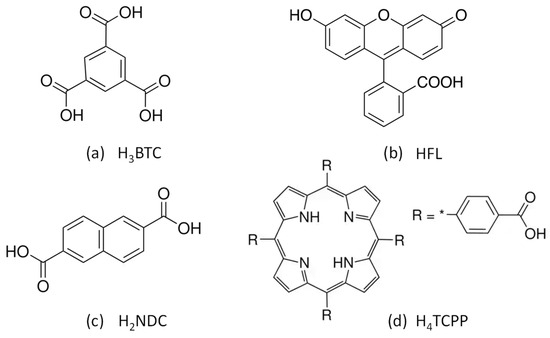 Bridging ligand and selected fluorophore molecules: (a) benzene-1,3,5-tricarboxylic acid, (b) fluorescein, (c) naphthalene-2,6-dicarboxylic acid, and (d) 4,4′,4″,4‴-(porphine-5,10,15,20-tetrayl)tetrakisbenzoic acid.