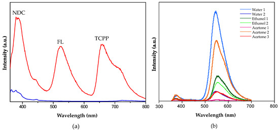 (a) Fluorescence intensity of Zr-BTC-NDC-FL-TCPP (red) and Zr-BTC (blue) gels excited at 325 nm. (b) Intensity of the fluorescent signals of the monoliths of the Zr-BTC-FL sample in different solvents, where the poor reproducibility of the measurements becomes evident.
