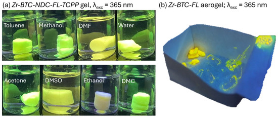 (a) Fluorescence emissions of freshly prepared Zr-BTC-NDC-FL-TCPP MOGs under 365 nm excitation when immersed in different solvents. (b) Fluorescence emissions under 365 nm excitation of the Zr-BTC-FL aerogel.