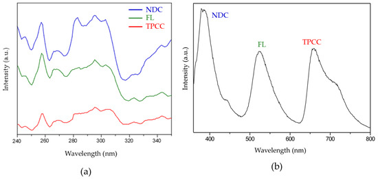 (a) Excitation spectra of the three fluorophores employed. (b) Emission spectra of Zr-BTC-NDC-FL-TCPP-SiO2 excited at 325 nm.