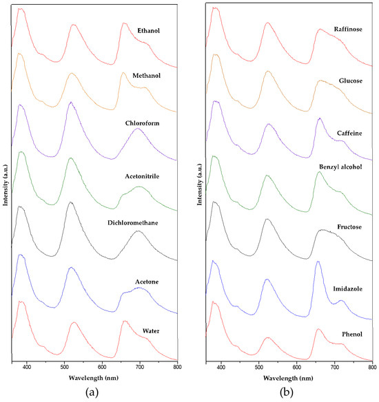 To develop a fluorescent sensor based on these materials, three fluorophores whose fluorescence emission closely matches the three primary colors (blue, yellow, and red) were selected: naphthalene-2,6-dicarboxylic acid (H2NDC), fluorescein (HFL), and 4,4′,4″,4‴-(porphine-5,10,15,20-tetrayl)tetrakisbenzoic acid (H4TCPP). Their combination within the same porous matrix provides a material that, upon excitation with the same wavelength, changes the emission of each fluorophore in a non-equal way, resulting in color changes that are visible to the naked eye. The fast gelation conditions obtained under the above-described synthetic conditions facilitates the incorporation of these complex mixtures of fluorophores by the coordination of their deprotonated counterparts to the zirconium metal centers, avoiding any possible segregation that could take place under slower thermodynamically driven reaction conditions. As result, this approach provided MOGs with deep blue (421 nm; Zr-BTC-NDC), yellow (530 nm; Zr-BTC-FL), and red (680/712 nm; Zr-BTC-TCPP) emissions (Figure 2 and Figure 3a). It is worth noting that the Zr-BTC gel also produces a fluorescence response in the violet spectrum (393 nm) but it is too weak to be used effectively for sensing purposes. The fluorescence maximum of the fluorophores anchored to the Zr-BTC system undergoes a slight redshift compared to the free molecules dissolved in water (380 nm for H3BTC [20,21], 426 nm for H2NDC [22,23], 500 nm for HFL [24], and 643/706 nm for the Q(0,0) and Q(0,1) emissions of H4TCPP [25,26,27]).
