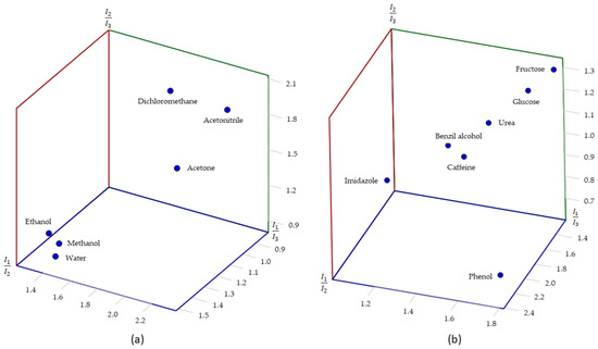 A comparable method could be developed using samples that contain a single fluorophore [7,28,29], but the results for different solvents/molecules would spread in just one dimension and provide less differentiated results or less specificity in the identification. Another option would be to employ three sets of samples with just one fluorophore in each one, but strict control of the sample amount and measurement setup would be required.