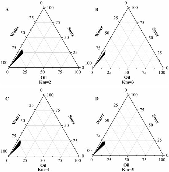 Pseudo-ternary phase diagram of the formed microemulsion for different Km’s; (A) Km = 2, (B) Km = 3, (C) Km = 4, (D) Km = 5.