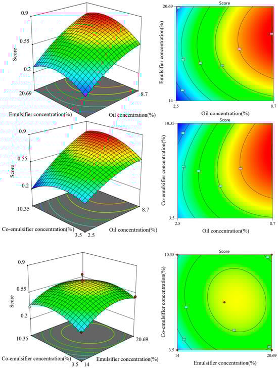 Figure 3 depicts the effects of independent variables such as oil phase, emulsifier, and co-emulsifier on the overall score. The 2D contour plot shows the interactive effects of two factors. The experimental data were fitted to derive the following equation for the comprehensive score: S = 0.6373 + 0.2114A + 0.0636B + 0.0098C − 0.03286AB − 0.0962AC − 0.1532BC − 0.0272A2 − 0.2316B2 − 0.193C2, with an R2 value of 0.9086. The model’s F-value is 5.75, and the p-value of 0.0155 demonstrates statistical significance [], indicating that the model provides a good fit and is suitable for analyzing the optimal formulation of the patchouli oil microemulsion. The factors’ influence on the preparation of the PO-ME were ranked in the following order: C > B > A. Analysis of the response surface and contour plots revealed that maintaining constant levels of emulsifiers or co-emulsifiers resulted in a decrease in comprehensive scores beyond certain thresholds, suggesting a non-linear relationship between these factors and the comprehensive score.