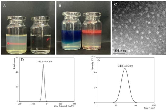 Place the copper grid on the hydrated film, and then add a drop of the sample diluted 200 times onto the film. Negative staining was performed by adding a small amount of 2% phosphotungstic acid dropwise onto a 200 mesh copper grid, allowing it to naturally evaporate and dry. The morphology was then observed under a transmission electron microscope (TEM, FEI Talos F200S, Thermo Technologies, Inc., Denver, CO, USA). To identify the type of microemulsion, staining was conducted by adding drops of methylene blue and Sudan III solutions to the microemulsion. The samples were then observed directly for 1 min []. Three batches of 1 mL patchouli oil microemulsions were selected, and their particle size and ζ potential were determined using a nanoparticle size and zeta potential analyzer (SZ-100 V2, Juna Technology Corporation, Shanghai, China) to predict the stability of the microemulsion system []. Three batches of ME were placed in a high-speed centrifuged set at 12,000 rpm and centrifuged for 30 min. After centrifugation, the appearance of the microemulsions was observed, and their particle sizes were measured. Finally, heating–cooling cycle tests were carried out on three batches of microemulsion by subjecting them to continuous temperature cycles between −20 °C and 25 °C for a total of 6 cycles. Following these cycles, the appearance of the microemulsion was assessed and its particle sizes were measured.