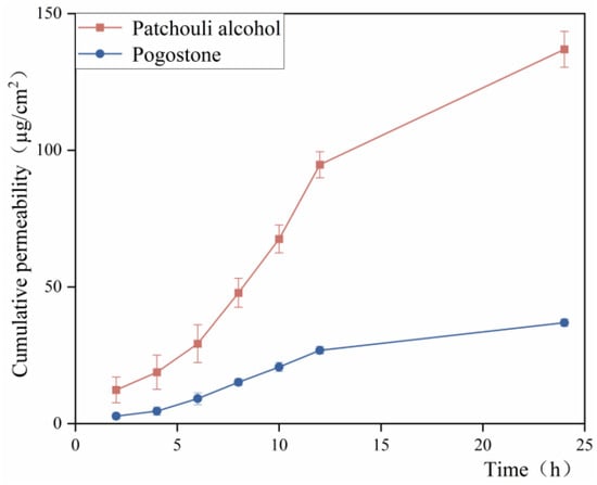 Figure 6 shows that the 24 h cumulative permeability of Patchouli alcohol and pogostone in the MEG group was 136.94 ± 6.58 µg/cm2 and 36.93 ± 1.4 µg/cm2, respectively in Table 2. The release of patchouli alcohol and pogostone from the PO-MEG occurred slowly over 24 h, with transdermal amounts stabilizing after 12 h. This behavior may be attributed to PO being retained in the deeper layers of the skin, allowing for more effective local action and indicating a slow-release effect of the gel. Additionally, the volatility of PO is mitigated by its formulation into the microemulsion gel, which helps to delay its evaporation and prolong the activity of its volatile components.