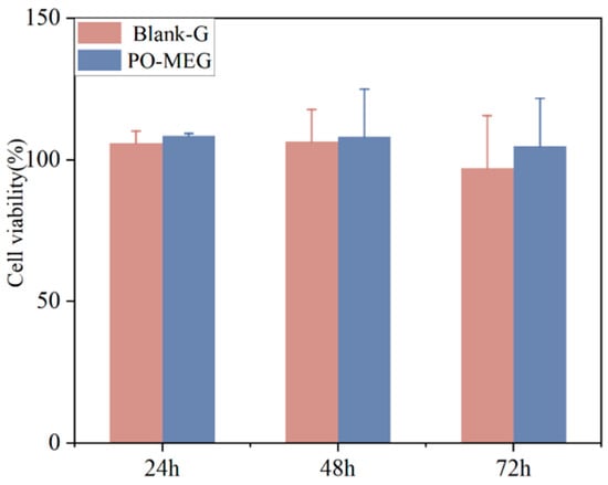 Cytotoxicity of PO-MEG and Blank-G was evaluated using the CCK-8 assay. As shown in Figure 7, treatment of HaCaT cells with Blank-G for 24, 48, and 72 h resulted in cell viabilities of 105.91%, 106.41%, and 97.03%, respectively. Similarly, treatment with PO-MEG for the same time points yielded cell viabilities of 108.54%, 108.21%, and 104.8%, respectively. The inhibition rates for both PO-MEG and Blank-G were less than 5%, indicating minimal cytotoxicity. These findings suggest that both PO-MEG and Blank-G are non-toxic to HaCaT cells and hold potential as candidates for skin drug-delivery systems.