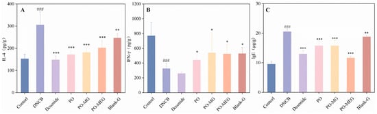 As shown in Figure 9, the model group exhibited significantly elevated levels of IgE and IL-4 in the skin compared to the control group, while IFN-γ levels were significantly reduced. In contrast, the treatment groups demonstrated significant decreases in IgE and IL-4 levels, accompanied by marked increases in IFN-γ levels. Notably, the Dinocap group showed a significant reduction in IFN-γ levels. These findings suggest that all treatments, including PO preparations and the blank gel, effectively lower IgE and IL-4 levels in the skin of AD mice while increasing IFN-γ levels.