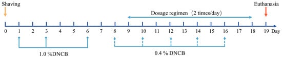 Under standard laboratory conditions, mice were housed at 20 to 28 °C and 50% to 60% humidity, with a 12 h light–dark cycle and free access to food and water. All animals were acclimatized for one week before the start of the experiment. To induce the AD model, the mice were first shaved on an area of approximately 3 × 3 cm2 on their backs and sensitized with 100 μL of a 1% DNCB solution (acetone/olive oil, 4:1, v/v) three times (in addition to the control group). Subsequent repeated challenges with 100 μL of a 0.4% DNCB solution five times induced AD-like skin lesions such as erythema, skin thickening, desquamation, oozing blood, and crusting [,,]. The experiments included control, Positive control (DNCB), free PO(PO), not nanoscaled patchouli oil gel (PO-MG), PO-MEG, blank gel (Blank-G), and Desonide groups, each consisting of 12 mice. Desonide, which has been clinically used for AD treatment, served as a positive control. To ensure effective drug absorption, all treatments were administered topically for 10 days twice daily []. A schematic diagram of the treatment protocol is depicted in Figure 10.