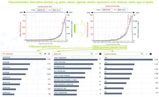 The methodology for searching for appropriate patents was conducted on the “Espacenet” [], a free database of the European Patent Office (EPO). The criteria for the search included classification symbols (using both the International Patent Classification (IPC) [,] and Cooperative Patent Classification (CPC) as a more detailed version of the ICP []) and definite keywords. Polysaccharides and derivatives thereof (e.g., starch, gums, dextrin, alginate, chitosan, hyaluronic acid, agar, inulin, or pectin), and their derivatives are classified in the A61K47/36 subgroup, based on IPC/CPC classification. Preparations with active medicinal ingredients are classified into subgroup A61K31/00, and the inactive modifying or targeting agents (i.e., inert additives, carriers) chemically bound to the active medicinal ingredient are classified into group A61K47/00. Medicinal preparation processes are classified into subgroup A61K9/00. The main selected groups and subgroups of IPC/CPC classification codes applied for this search are listed in Table 1.