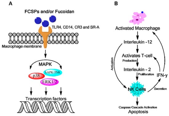 Proposed mechanism responsible for fucoidan bioactivity: (A) macrophage activation by fucose-containing sulfated polysaccharides (FCSPs) as mediated through specific membrane receptor activation, namely Toll-like receptor-4, cluster of differentiation 14, competent receptor-3, and scavenging receptor, which in turn induce intracellular signaling via mitogen-activated protein kinases (MAPKs); (B) activation of macrophages lead to the production of cytokines such as interleukins (ILs) IL-12 and IL-2 and interferon-gama (IFN-γ), which enhance natural killer (NK) cell activation that may stimulate T-cell activation further via IFN-γ. Reprinted from ref. [] under open access creative commons CC-BY license.
