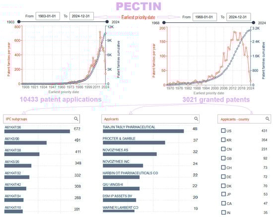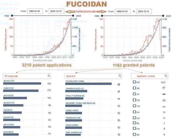 In the Espacenet database [], a search shows that there are 3210 patent documents and 1163 granted patents in the period from the first patent application in 1962 to the latest on 20 October 2024 for “fucoidan”, according to the patent claims (Figure 3). The country of origin of the first granted patent JPS505199B1 was Japan []. Based on IPC/CPC subclasses, the largest number of granted patents is classified into the following classes: