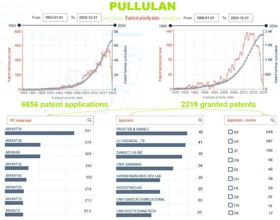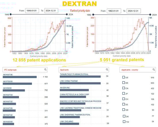 Dextran: cumulative and yearly numbers of patent applications and granted patents depending on the earliest priority date (from 1949 to 2024), the IPC subgroups, the first eight applicants, and countries for granted patents. Two-letter codes: US, KR, CN, JP, CH, DE, GB, DK, and TW are abbreviations for the following: United States of America, Republic of Korea, Republic of China, Japan, Switzerland, Germany, Great Britain, Denmark, and Taiwan Province of China, respectively. Data were obtained using the Espacenet database [].