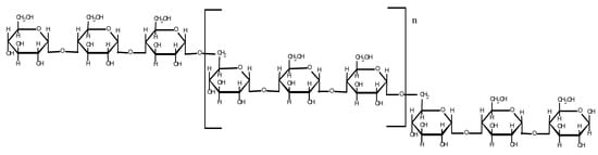Pullulan is a neutral amorphous, water-soluble, viscous polysaccharide with linear, inflected chains whose main axis consists of the units α-D-glucose, firstly formed by the activity of Aureobasidium pullulans fungi at starch. A regularly repeated structural unit in pullulan is maltotriose (α-1,4-triglucoside) interconnected by α-(1→6) glycosidic bonds, shown by the structural formula in Figure 8 [].