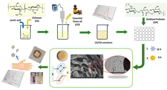 It was revealed by Bauer in 1938 [] and called “pullulans” by Bender in 1959 []. Some fungal species (Aureobasidium spp., Cytaria spp., Teloschistes flavicans, Rhodototula bacarum, and Cryphonectria parasitica) have been used for commercial production, but Aureobasidium pullulans is preferred due to superior properties of produced pullulan and high production rate []. Nowadays, the current interest is pullulan production from low-cost substrates to reduce its price. Pullulan is a non-branched, non-immunogenic, non-toxic, non-carcinogenic, non-mutagenic exopolysaccharide explored for various pharmaceutical (e.g., for targeted hydrophobic and hydrophilic drugs or gene delivery, tissue engineering, wound healing []) and medical applications (e.g., in diagnostic usage like receptor, perfusion and lymph node, target-specific imaging, and vascular imaging) [,]. However, these poor mechanical features are improved by combining them with various polymers. Pullulan is used to design hydrogels, with chemical modification [,], to improve some biological, physical, and chemical properties for potential medical applications []. The incorporation of pullulan with various natural polymers in wound dressings is attracting much attention due to its antioxidant, antimicrobial, and non-immunogenic characteristics []. For example, emulsion chitosan-oxidized pullulan hydrogels with loaded clove oil are synthesized by covalent and physical cross-linking. Clove oil was emulsified and stabilized in a chitosan solution and hardened by Schiff base covalent cross-linking with oxidized pullulan and thereafter subjected to freeze–thaw cycles for physical cross-linking (Figure 9) []. The resulting hydrogels showed strong radical scavenging (83%), antifungal, and antibacterial activity, with bacteriostatic activity after 2 and 3 days against S. aureus and E. coli, and can be applied as wound dressings.