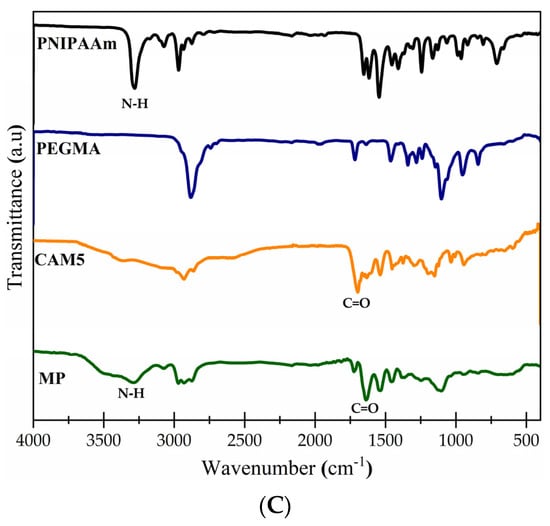 The monomers and polymerized microgels (MP) were characterized using Fourier-transform infrared spectroscopy (FTIR) to compare their spectra and confirm successful MP polymerization. FTIR analysis was performed for CAM5 (Figure 1A,C), MP 10% CAM5 (Figure 1B,C), PNIPAAm, and PEGMA (Figure 1C). Characteristic peaks were identified as follows: PNIPAAm: N-H stretching (3288 cm⁻1), N-H bending (1535 cm⁻1), and C=O (1723 cm⁻1). CAM5: N-H stretching (3387 cm⁻1), N-H bending (1535 cm⁻1), C=O stretching (1723 cm⁻1), CH sp2 (2930 cm⁻1), C=O (carboxylic acid, 1697 cm⁻1), C=O (amide, 1638 cm⁻1), CH2 bending (1459 cm⁻1), and C-O (1150 cm⁻1). PEGMA: C-H (2900 cm⁻1), C-O (1100 cm⁻1), and C=O (1700 cm⁻1). For MP 10% CAM5, strong absorption bands from both NIPAAm and CAM5 were observed, including N-H stretching (3288 cm⁻1), C-H (2970 cm⁻1), C=O (carboxylic acid, 1723 cm⁻1), C=O (amide, 1637 cm⁻1), N-H bending (1535 cm⁻1), CH2 bending (1456 cm⁻1), and C-O (1104 cm⁻1). Additionally, Figure 1C shows a shift in the peak near 1630 cm⁻1, attributed to the presence of amide functional groups in the monomers, further confirming successful MP polymerization.