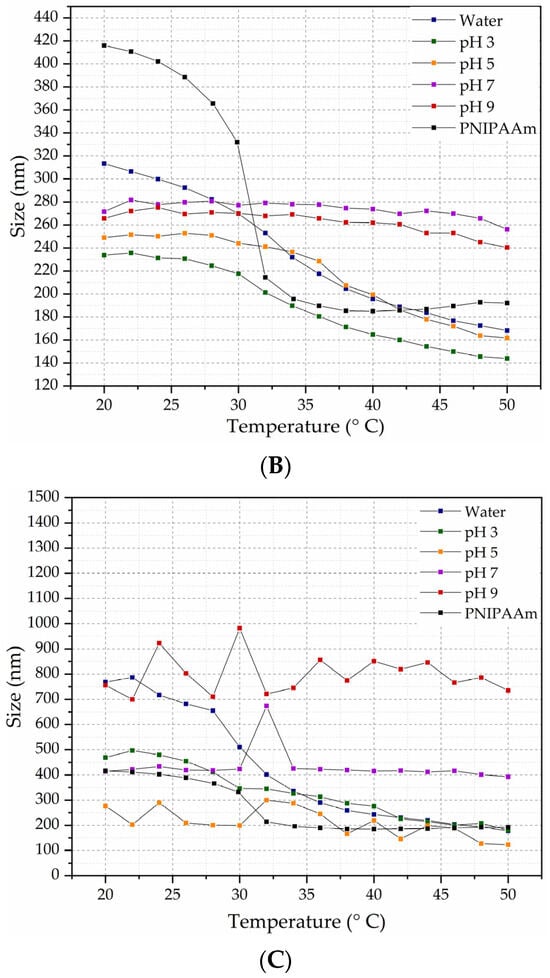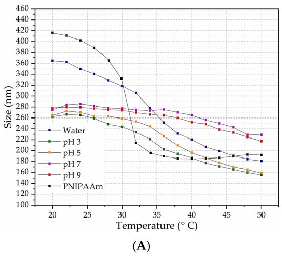 To determine the transition temperature of 1% MP with 5, 10, and 15% CAM5, the size-temperature analysis was performed from 20 to 50 °C in pH 3, 5, 7, and 9. In Figure 3, the results are presented as size-temperature comparative graphics. As shown in Figure 3A,B, with the well-known NIPAAm size transition at 32 °C from 420 to 190 nm, there is no LCT with MP (5% and 10% of CAM5) in pH 7. However, there is a size reduction from 260 nm (30 °C) to 200 nm (40 °C) for MP 5% CAM5 and from 240 (30 °C) to 200 nm (40 °C) for MP 10% of CAM5 in pH 5.