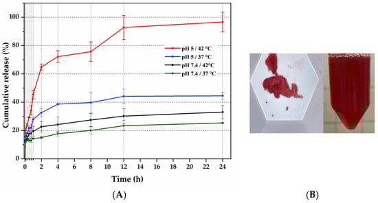 The Dox release study was performed by placing microgels in release media at pH 5 or 7.4 and 37 °C or 42 °C (Figure 4A). The Dox released was quantified by UV-Vis485 nm. The percentage of drug released up to 24 h at pH 7.4 was 24% at 37 °C and 32% at 42 °C, at pH 5 was 44% at 37 °C and 96% at 42 °C. This behavior may be due to the sensitivity of MP 10% CAM5 to the lower pH release medium, which has been shown to decrease the size and increase transition temperature, as previously reported [].