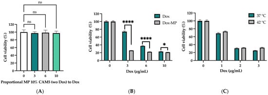 In vitro cytotoxicity in HeLa cell line of (A) MP 10% CAM5 (without Dox), (B) Dox vs. Dox-MP 10% CAM5 and, (C) Dox-MP 10% CAM5 (37 vs. 42 °C). Data are presented as means ± SD (n = 5). * p 0.0366, **** p < 0.0001 vs. Dox. No statistically differences were detected among treating cells at different temperatures (ns).