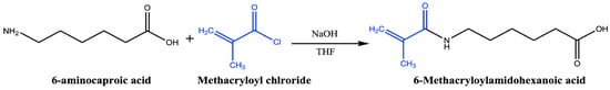 The synthesis of amphiphilic acid, 6-methacryloylamidohexanoic acid (CAM5), was performed using the Schotten–Bauman method from 6-aminocapropic acid and methacryloyl chloride (Figure 6), as reported by Magaña et al. [] Briefly, 6-aminocaproic acid was dissolved in a solution of NaOH 1 M with Tetrahydrofuran, and methacryloyl chloride was added drop by drop. Then the resulting solution was acidified with HCl to pH 3, and finally, the monomer was extracted with ethylic ether and purified. The resulting product was characterized by FTIR-ATR and 1H NMR.